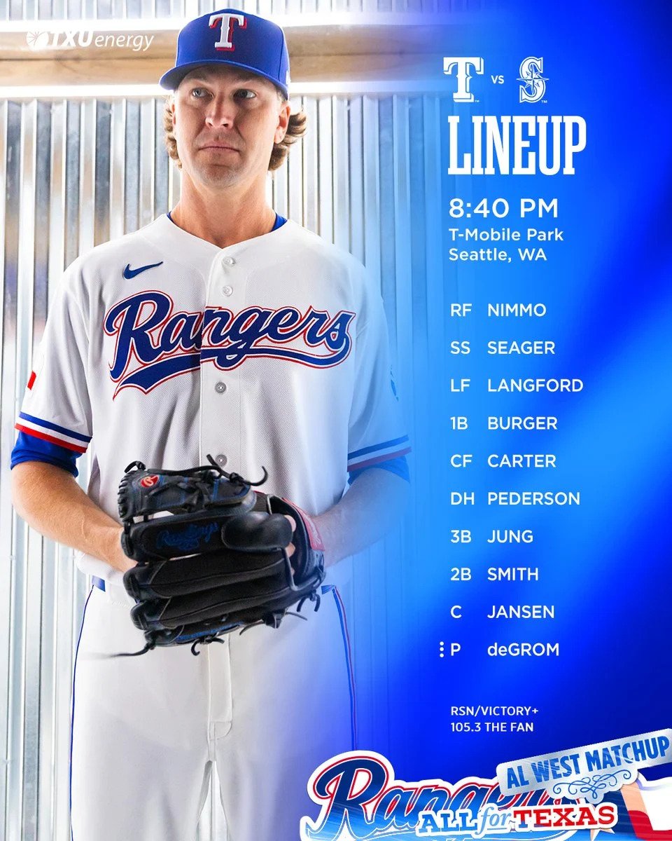 The Rangers will roll with Joc Pederson and a weirdly dour-looking deGrom. No really, why is this the promo photo?