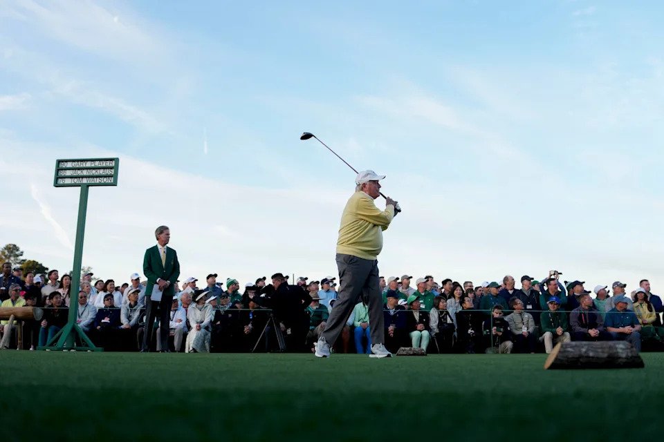 Honorary Starters Gary Player, Tom Watson and Jack Nicklaus look on from the first tee during the first round of the 2026 Masters Tournament at Augusta National Golf Club on April 9, 2026 in Augusta, Georgia. (Photo by Andrew Redington/Getty Images) Andrew Redington/Getty Images
