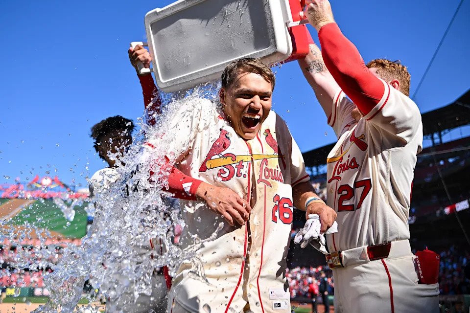 The St. Louis Cardinals’ JJ Wetherholt is doused with water by teammates after hitting a walk-off two-run single against the Tampa Bay Rays during the 10th inning at Busch Stadium on March 28, 2026.