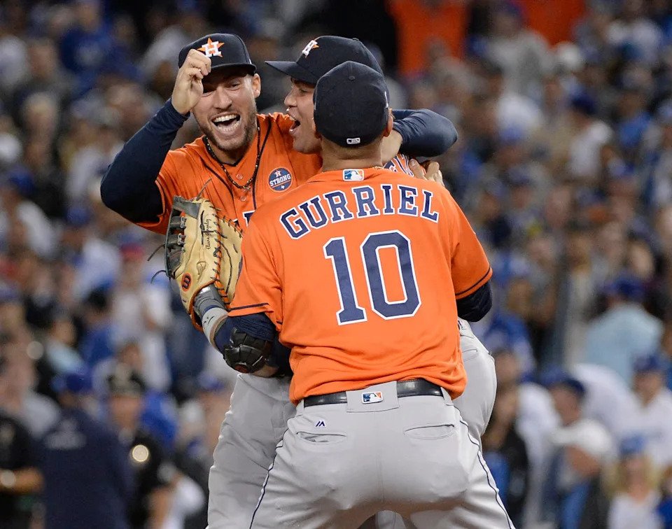 Houston Astros players Yuli Gurriel (10) , Carlos Beltran (15) and George Springer (4) celebrate after defeating the Los Angeles Dodgers in Game 7 of the 2017 World Series at Dodger Stadium. Beltran won his only World Series with the Astos.