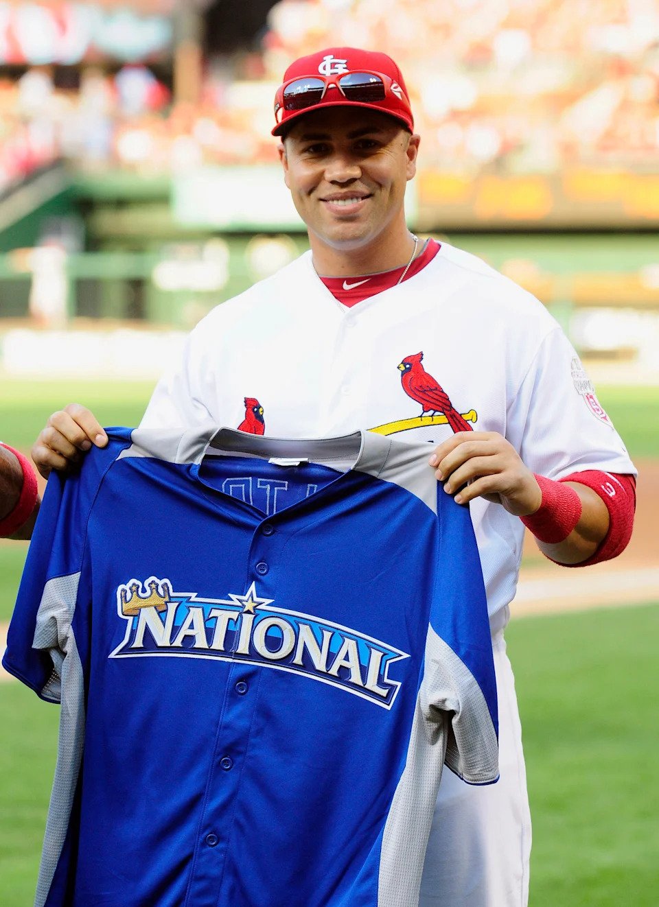 St. Louis Cardinals right fielder Carlos Beltran (3) poses with his National League All Star Game jersey before a game against the Miami Marlins at Busch Stadium on July 6, 2012. Beltran was an All Star nine times.