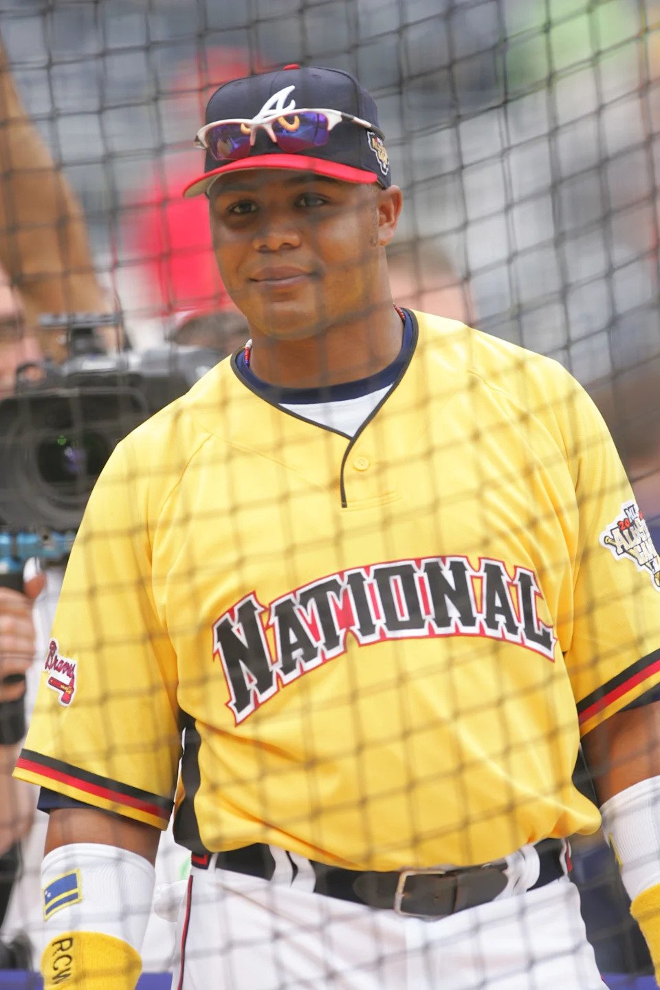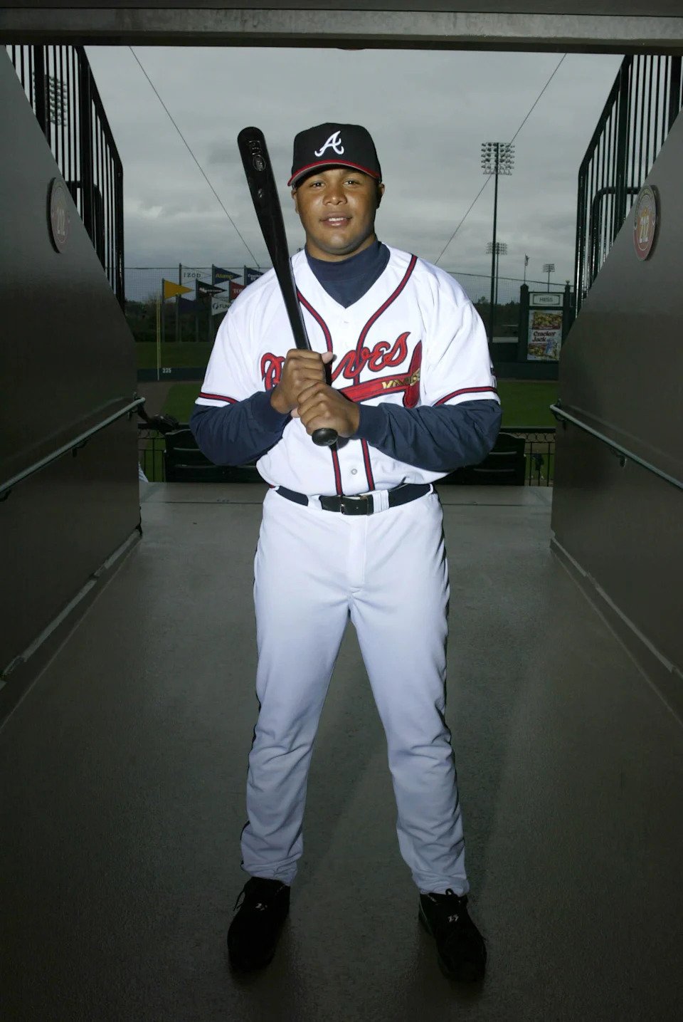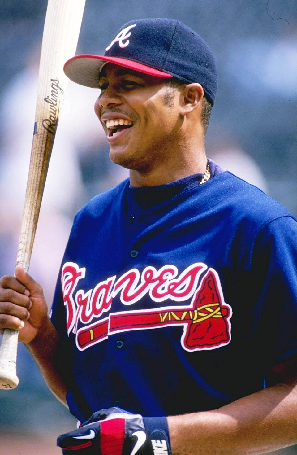 Andruw Jones of the Atlanta Braves looks on during a game against the Colorado Rockies at Coors Field in Denver, Colo. on Sept. 12, 1996. Andruw Jones played 17 seasons, primarily with the Atlanta Braves, from his debut in 1996 until his last MLB game in 2012, also playing for the Dodgers, Rangers, White Sox, and Yankees, before finishing his career in Japan in 2013.
