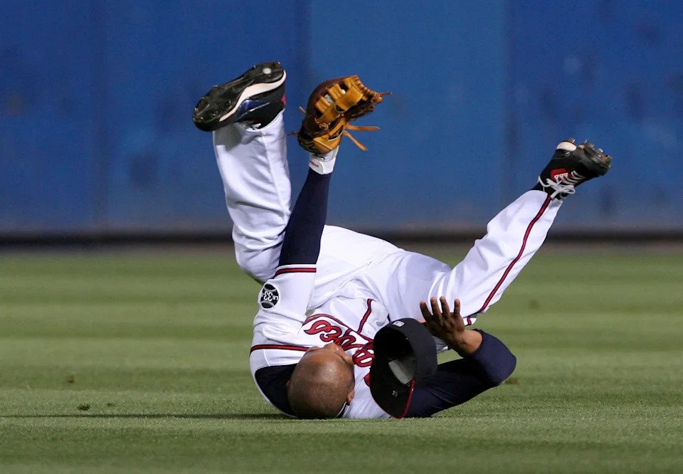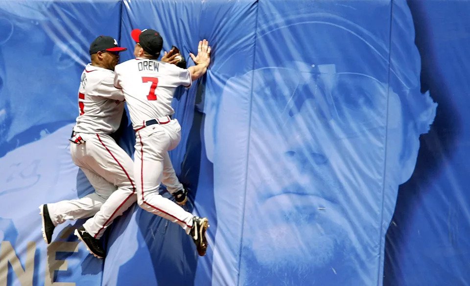 Center fielder Andruw Jones #25 of the Atlanta Braves makes a catch against the wall despite colliding with right fielder J.D. Drew #7 on a fly ball hit by Jayson Werth of the Los Angeles Dodgers in the third inning at Dodger Stadium on August 21, 2004 in Los Angeles, Calif. Jones was known for his great defense and won 10 Gold Gloves.