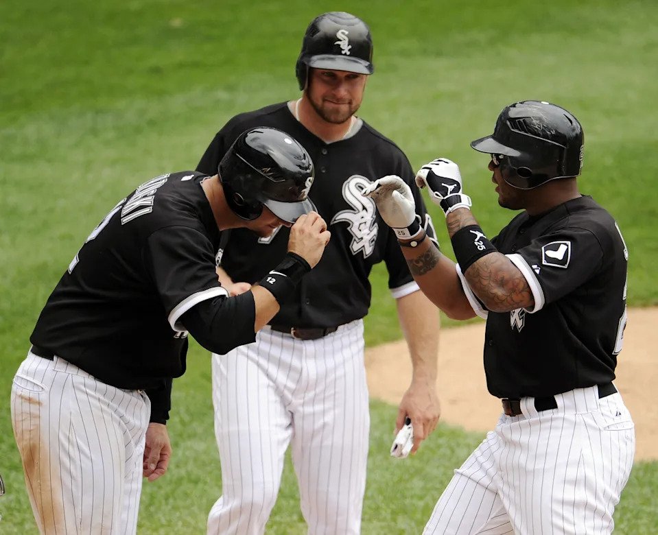 Andruw Jones #25 is greeted by A.J. Pierzynski #12 and Mark Kotsay #7 of the Chicago White Sox at home plate after hitting Jones hit his 400th career home run in 2010.