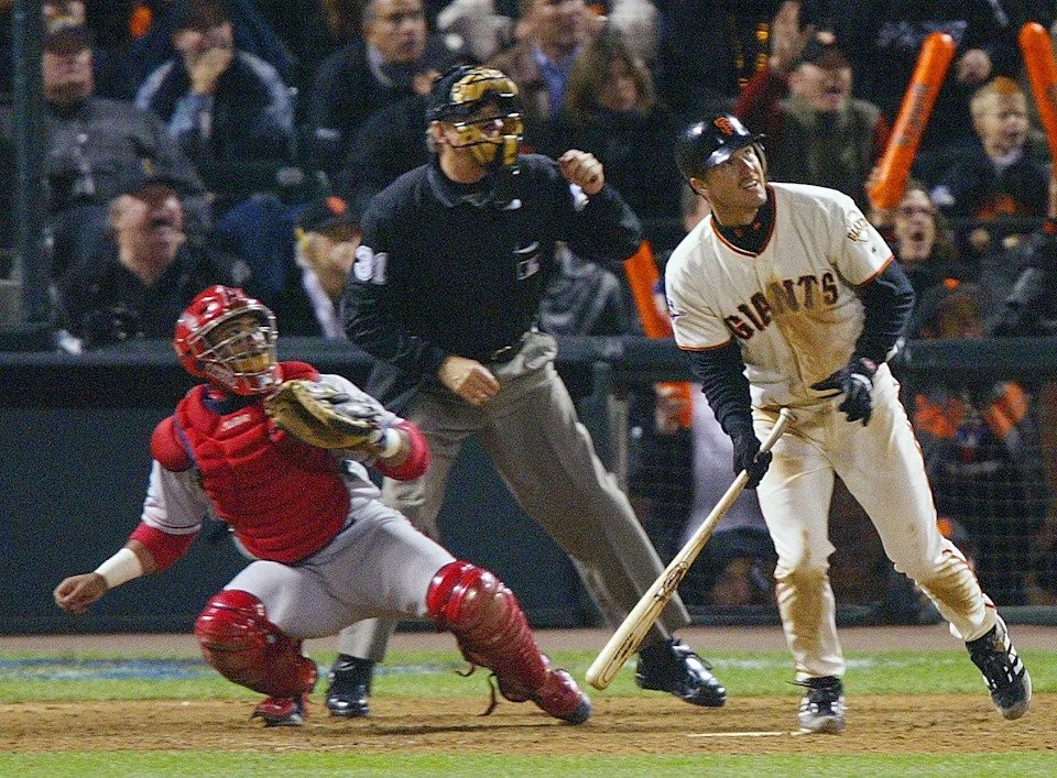 San Francisco Giant Jeff Kent watches his two-run home run head for the fence as Anaheim Angels catcher Bengie Molina and home plate umpire Mike Reilly watch in the sixth inning in Game Five in the World Series in San Francisco on Oct. 24, 2002. Jeff Kent was a four-time Silver Slugger Award winner (2000-2002, 2005) .