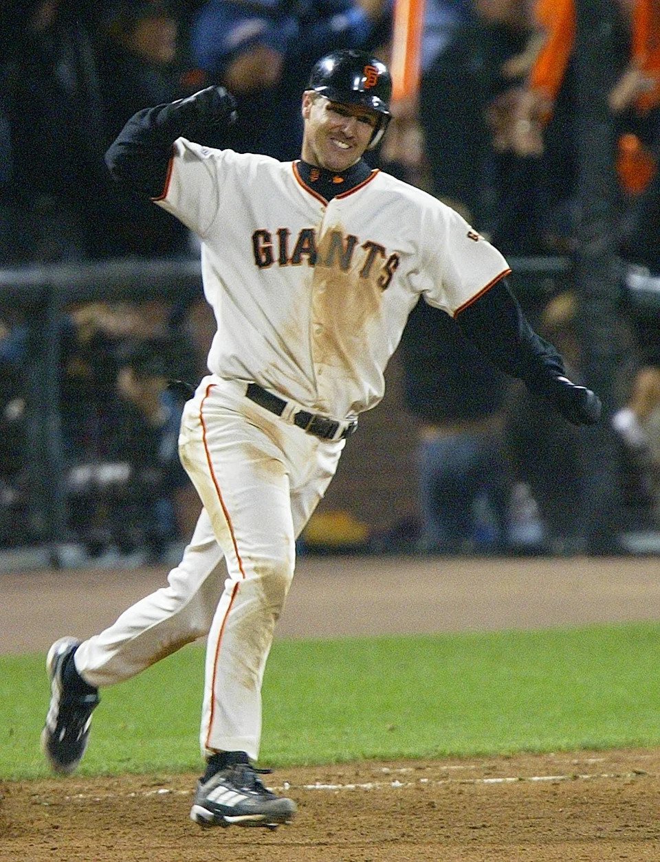 San Francisco Giant Jeff Kent pumps his fist after hitting a two-run home run against the Anaheim Angels in the sixth inning in Game 5 of the 2002 World Series.