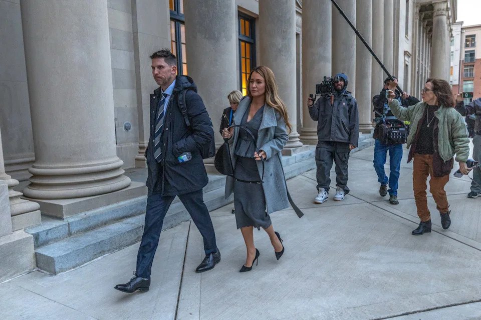 NASCAR Driver Denny Hamlin (L) and wife Jordan Fish depart the Charles R Jonas Federal Building on Dec. 1, 2025 in Charlotte, North Carolina. Jury selection and an opening statement began an antitrust lawsuit filed by Michael Jordan’s 23XI Racing team against NASCAR.