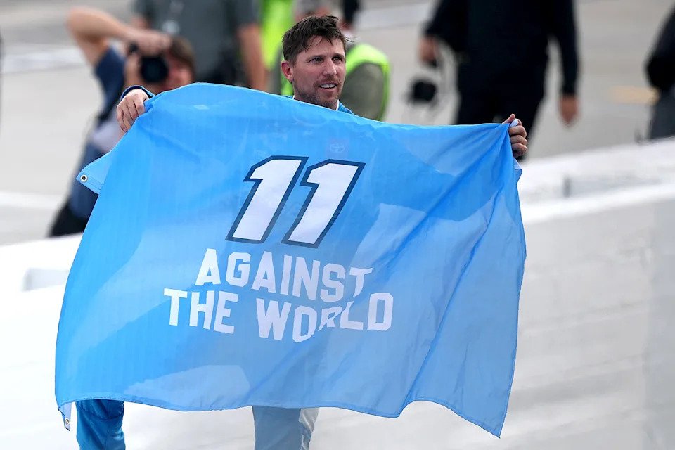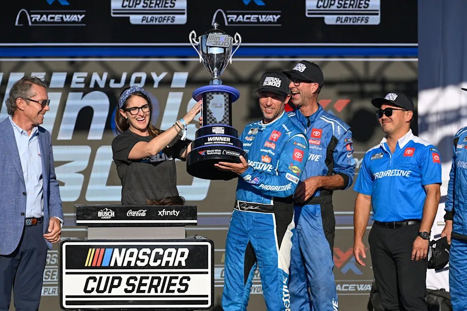 MADISON, ILLINOIS – SEPTEMBER 07: Denny Hamlin, driver of the #11 Progressive Toyota, exits his car after winning the NASCAR Cup Series Enjoy Illinois 300 at WWT Raceway on September 07, 2025 in Madison, Illinois. (Photo by Sean Gardner/Getty Images)