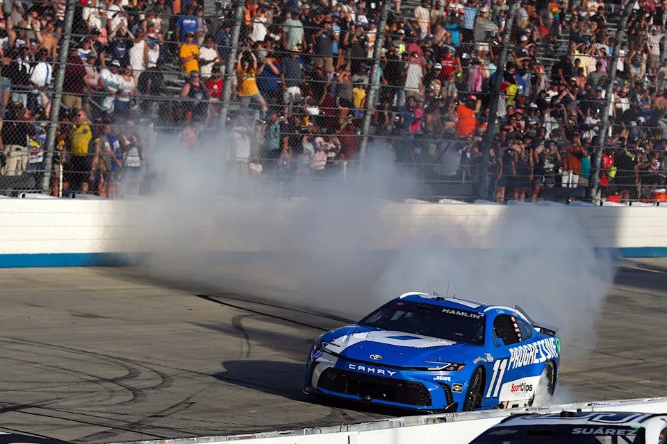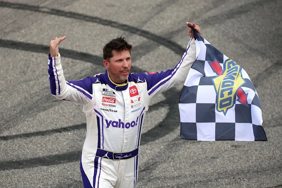 BROOKLYN, MICHIGAN – JUNE 08: Denny Hamlin, driver of the #11 Yahoo! Toyota, celebrates with the checkered flag after winning the NASCAR Cup Series FireKeepers Casino 400 at Michigan International Speedway on June 08, 2025 in Brooklyn, Michigan. (Photo by Chris Graythen/Getty Images)