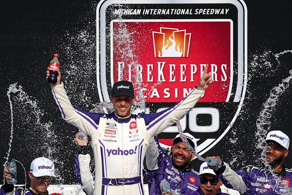 BROOKLYN, MICHIGAN – JUNE 08: Denny Hamlin, driver of the #11 Yahoo! Toyota, celebrates in victory lane after winning the NASCAR Cup Series FireKeepers Casino 400 at Michigan International Speedway on June 08, 2025 in Brooklyn, Michigan. (Photo by Chris Graythen/Getty Images)