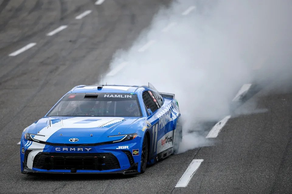 MARTINSVILLE, VIRGINIA – MARCH 30: Denny Hamlin, driver of the #11 Progressive Toyota, celebrates with a burnout after winning the NASCAR Cup Series Cook Out 400 at Martinsville Speedway on March 30, 2025 in Martinsville, Virginia. (Photo by Jared C. Tilton/Getty Images)