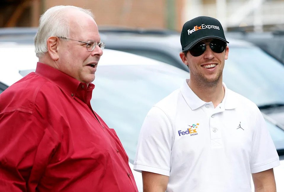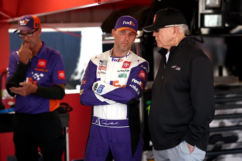 MARTINSVILLE, VIRGINIA – NOVEMBER 02: Denny Hamlin, driver of the #11 FedEx One Rate Toyota, and JGR team owner and NASCAR Hall of Famer, Joe Gibbs talk in the garage area after an on-track incident during practice for the NASCAR Cup Series Xfinity 500 at Martinsville Speedway on November 02, 2024 in Martinsville, Virginia. (Photo by Jared C. Tilton/Getty Images)
