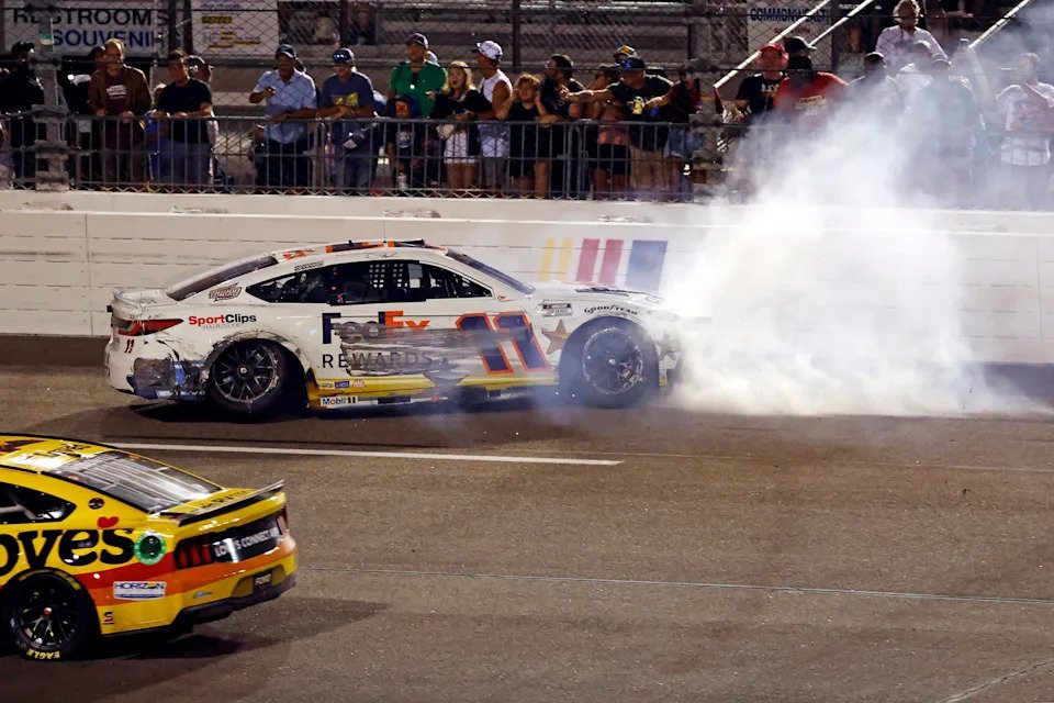 Aug 11, 2024; Richmond, Virginia, USA; NASCAR Cup Series driver Denny Hamlin (11) wrecks after the finish of the race during the Cook Out 400 at Richmond Raceway. Mandatory Credit: Peter Casey-USA TODAY Sports