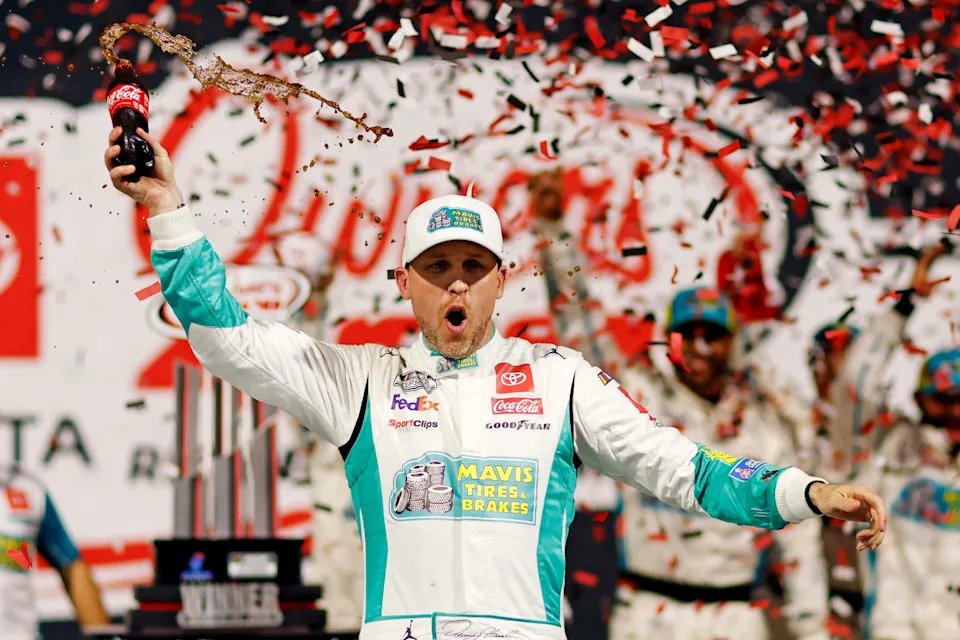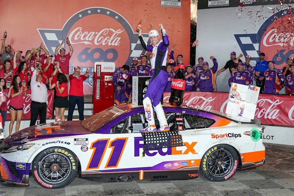 Denny Hamlin celebrates after winning the 2022 Coca-Cola 600 at Charlotte Motor Speedway.