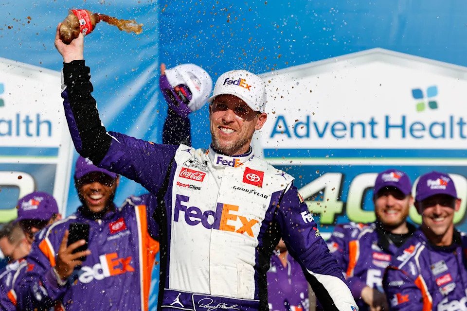 Denny Hamlin celebrates after winning the AdventHealth 400, Sunday at Kansas Speedway.