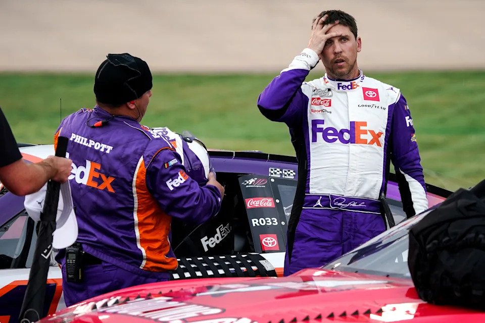 NASCAR Cup Series driver Denny Hamlin (11) exits his car after a second weather delay during the Ally 400 at the Nashville Superspeedway in Lebanon, Tenn., Sunday, June 26, 2022.