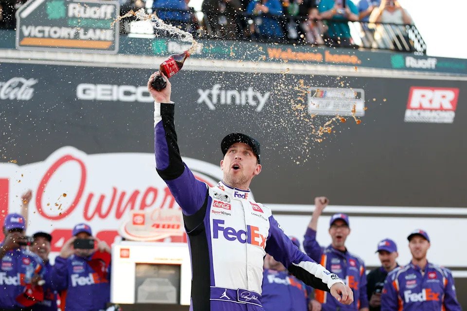 LAS VEGAS, NEVADA – OCTOBER 12: Denny Hamlin, driver of the #11 ampm Toyota, celebrates in victory lane after winning the NASCAR Cup Series South Point 400 at Las Vegas Motor Speedway on October 12, 2025 in Las Vegas, Nevada. (Photo by Logan Riely/Getty Images)