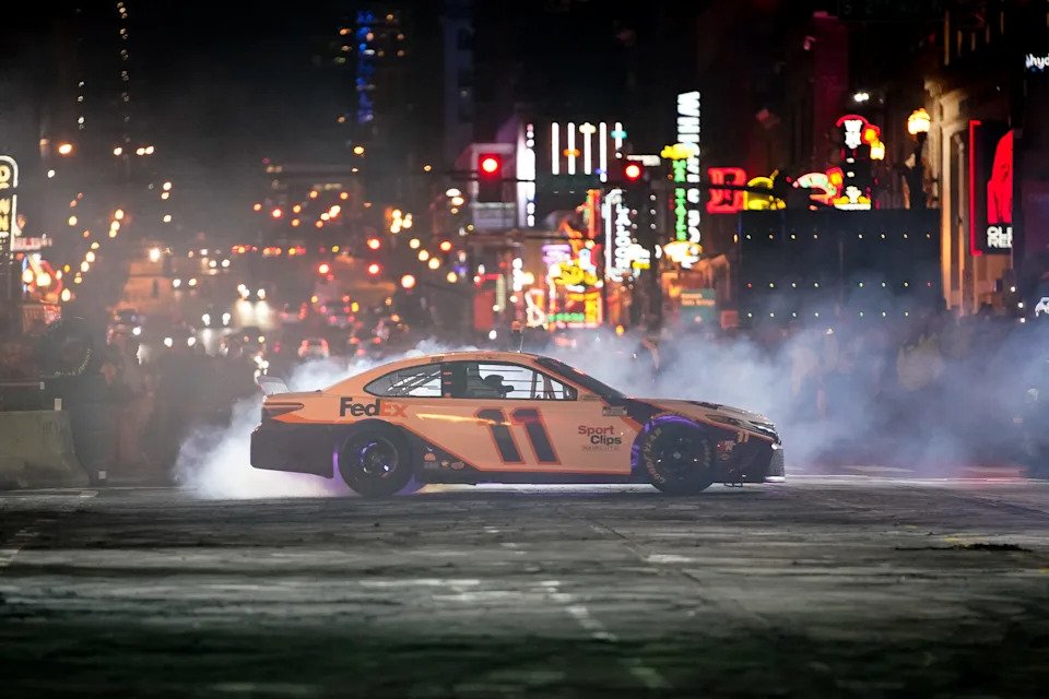 Denny Hamlin drives during the NASCAR Burnouts on Broadway event on Lower Broadway in Nashville, Tenn., Wednesday, Dec. 1, 2021.