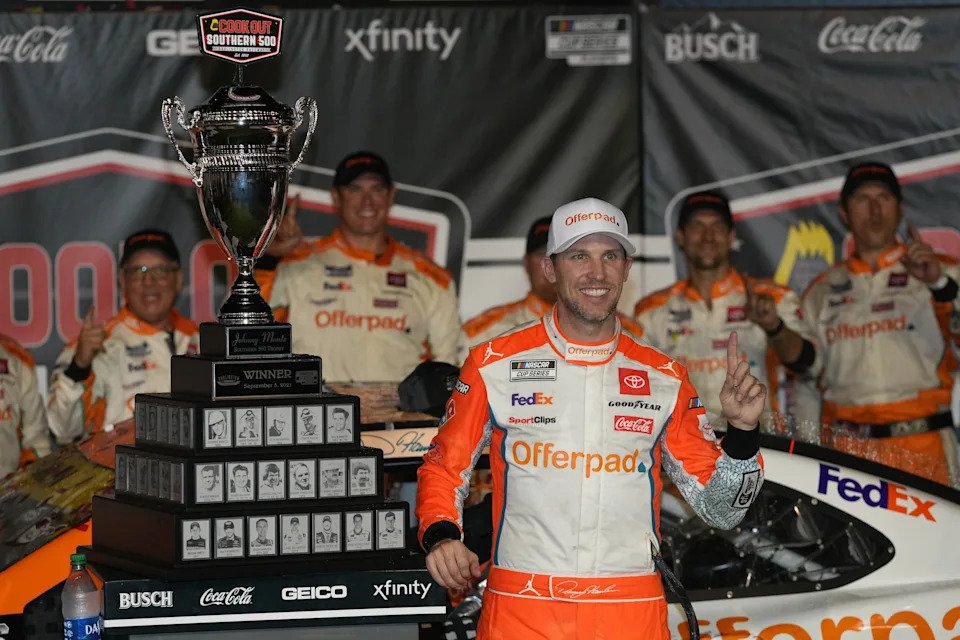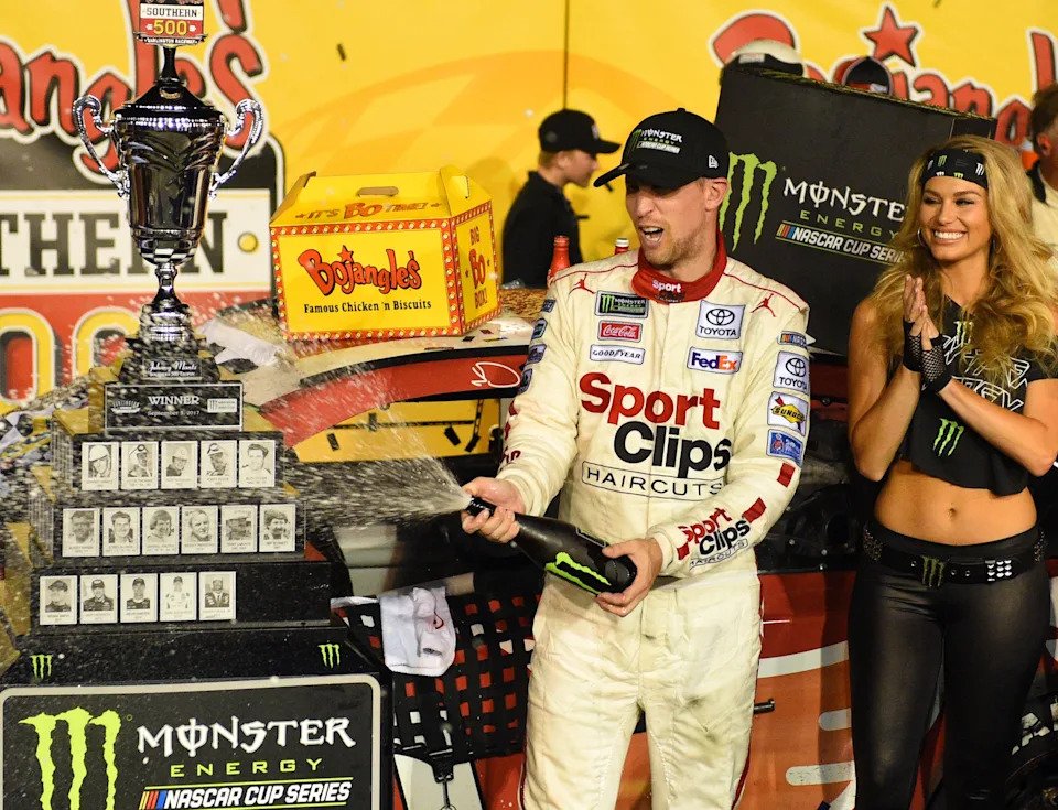 Sept 5: Denny Hamlin celebrates after winning the Cook Out Southern 500 at Darlington Raceway.