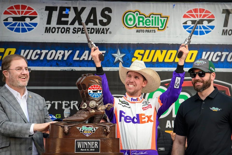 Denny Hamlin celebrates at Texas Motor Speedway in 2019.