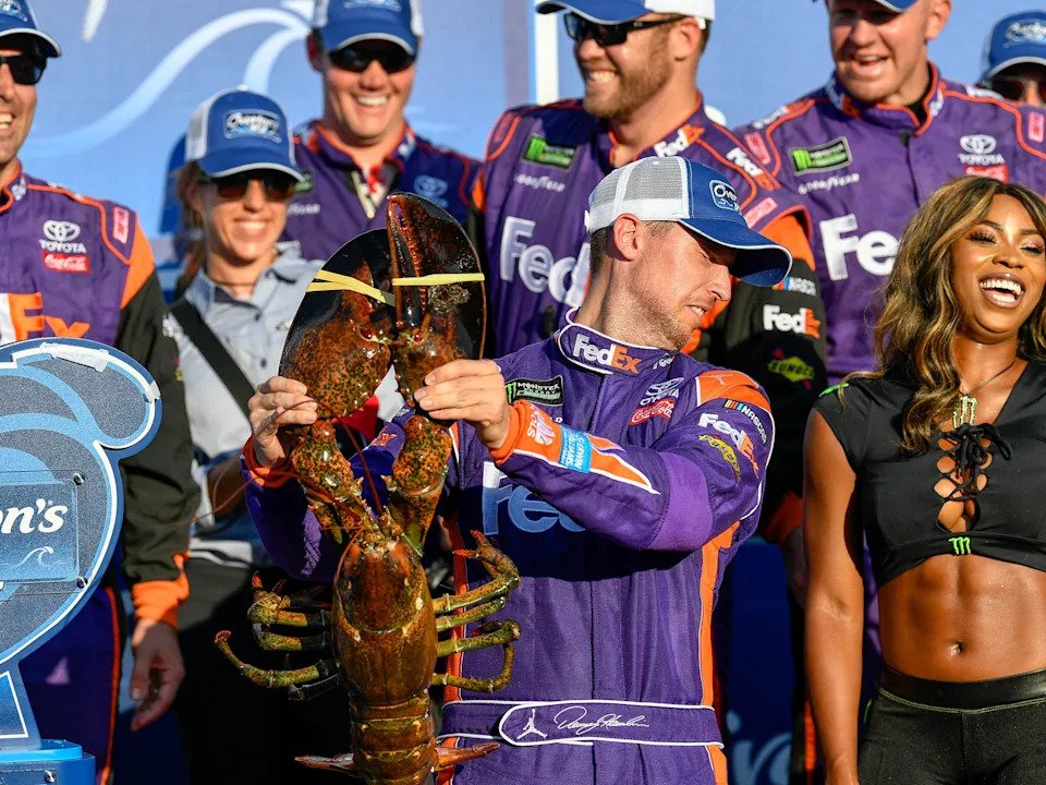Denny Hamlin reacts as he holds a lobster winning at New Hampshire Motor Speedway in 2017.