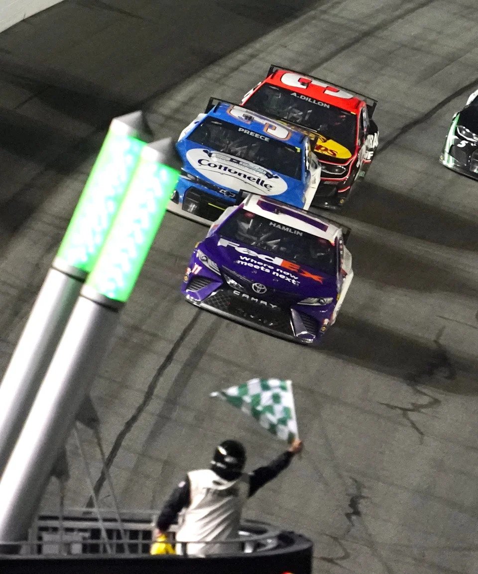 Denny Hamlin, the two-time defending Daytona 500 champion, won the first stage of the rain-delayed 2021 race Sunday Feb. 14, 2021, at Daytona International Speedway.