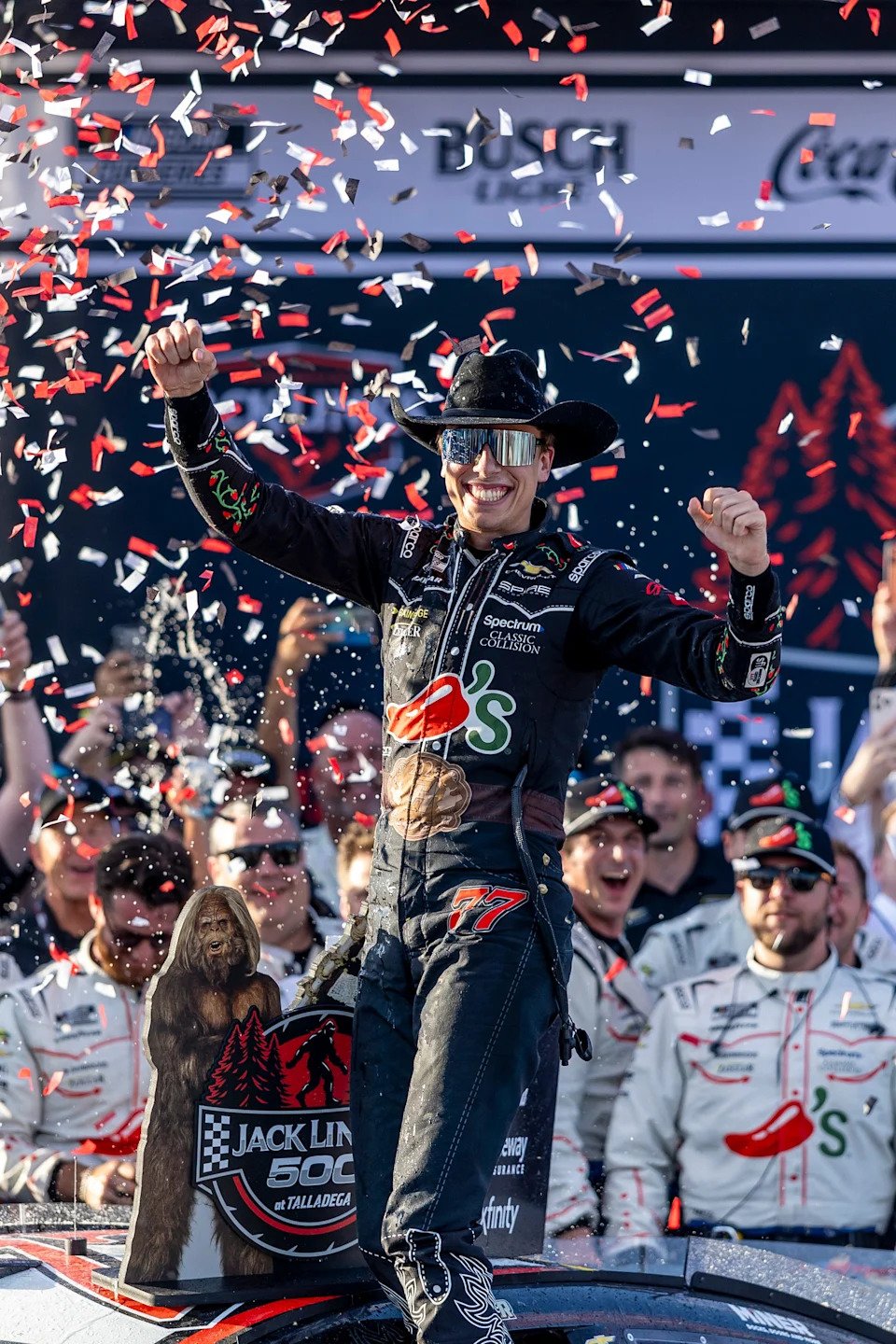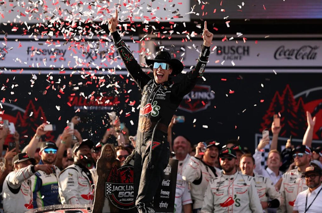 TALLADEGA, ALABAMA – APRIL 26: Carson Hocevar, driver of the #77 Chili’s Ride the ‘Dente Chevrolet, celebrates after winning the NASCAR Cup Series Jack Link’s 500 at Talladega Superspeedway on April 26, 2026 in Talladega, Alabama. (Photo by Sean Gardner/Getty Images)
