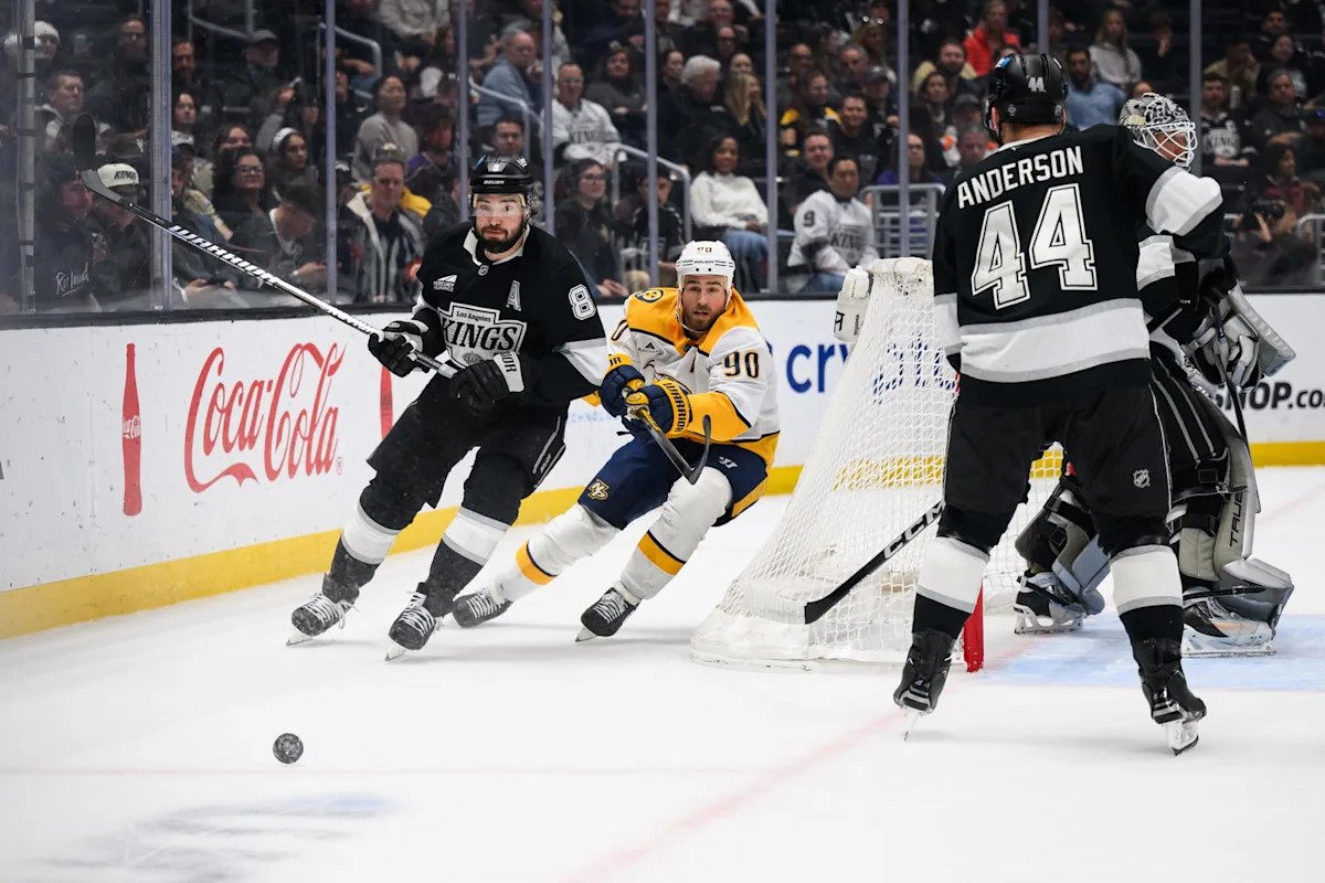 Turnovers haunted Nashville, which allowed two goals in regulation. A turnover by Tyson Jost in the neutral zone led to a Kings rush the other way and a goal by Joel Armia to put LA up 1-0 in the first period.