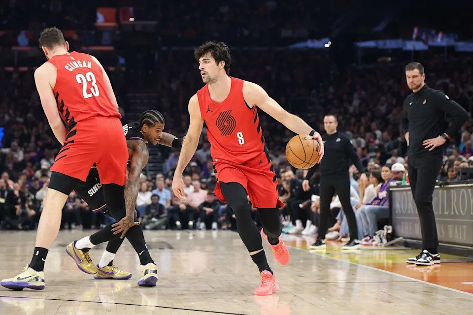 Deni Avdija #8 of the Portland Trail Blazers handles the ball ahead of Jalen Green #4 of the Phoenix Suns during the first half of an NBA play-in tournament game at Mortgage Matchup Center on April 14, 2026, in Phoenix, Arizona.