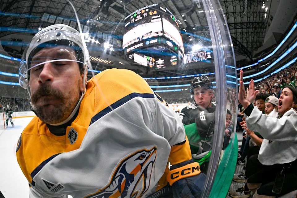 Feb. 28: The Nashville Predators’ Filip Forsberg hits the boards alongside the Dallas Stars’ Nils Lundkvist during the third period at the American Airlines Center.