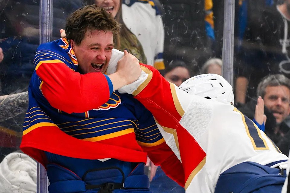 Jan. 29: St. Louis Blues defenseman Tyler Tucker (left) fights Florida Panthers left wing A.J. Greer during the second period at Enterprise Center.