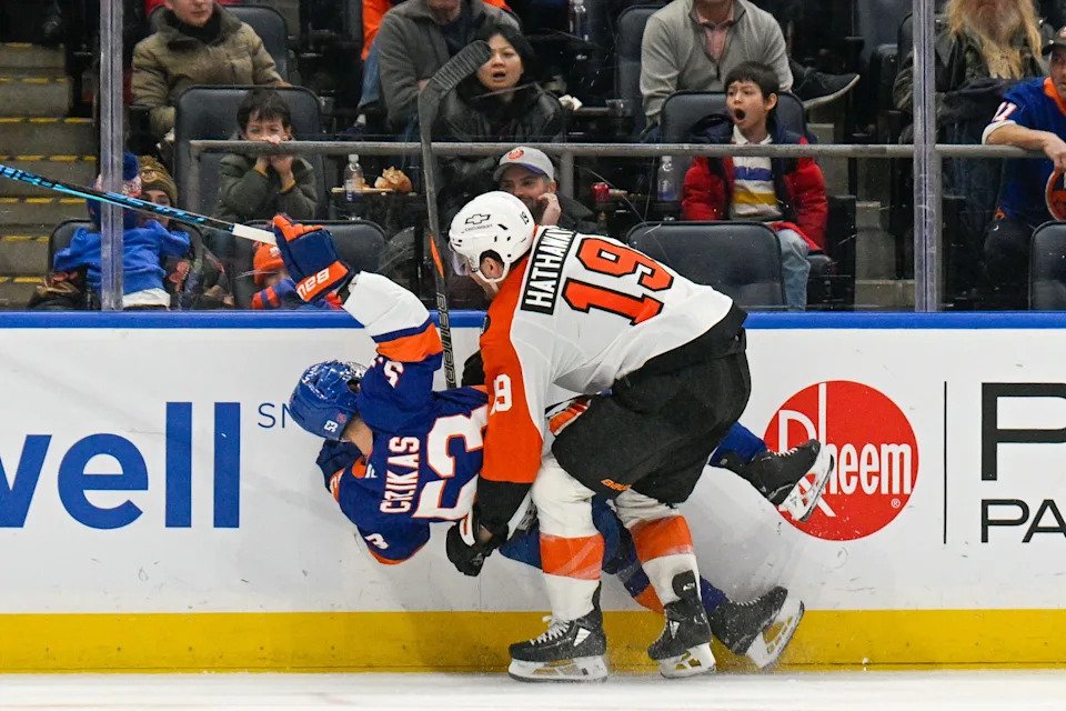 Nov. 28: Philadelphia Flyers right wing Garnet Hathaway (19) checks New York Islanders center Casey Cizikas (53) during the second period at UBS Arena.