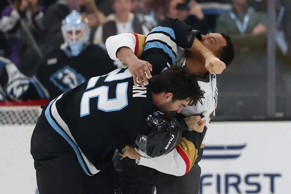 Utah Mammoth center Jack McBain (22) and Vegas Golden Knights right wing Keegan Kolesar (55) fight during the third period at Delta Center.