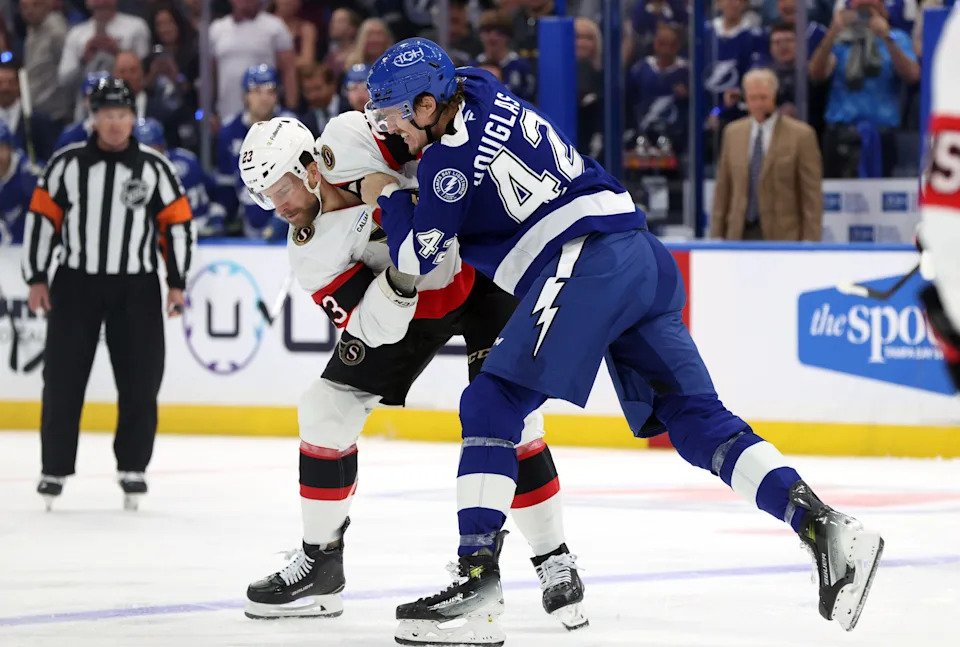 Oct. 9: Tampa Bay Lightning defenseman Darren Raddysh (43) and Ottawa Senators left wing Kurtis MacDermid (23) fight during the first period at Benchmark International Arena.