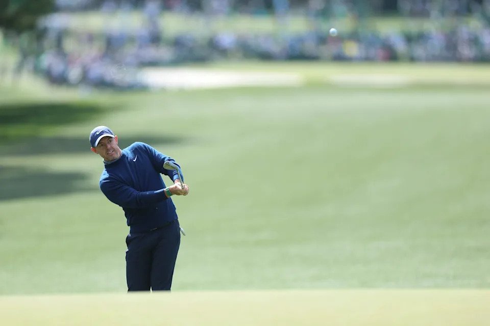 Rory McIlroy of Northern Ireland chips onto the second green during the first round of the 2026 Masters Tournament at Augusta National Golf Club on April 9, 2026 in Augusta, Georgia.