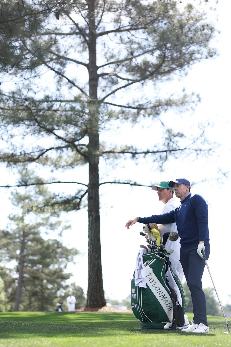 Rory McIlroy of Northern Ireland his caddie Harry Diamond looks on while playing the eighth hole during the first round of the 2026 Masters Tournament at Augusta National Golf Club on April 9, 2026 in Augusta, Georgia.