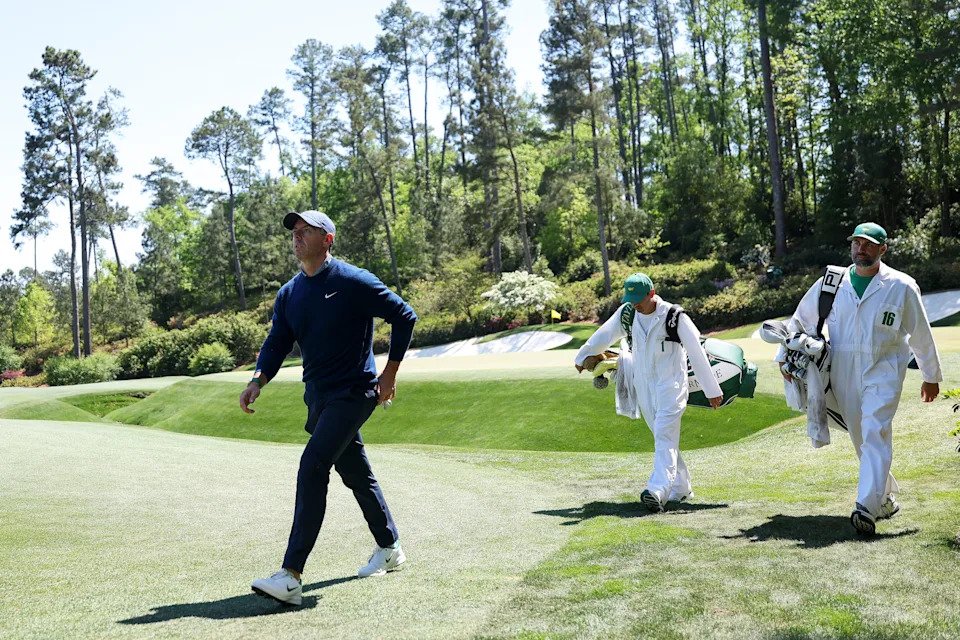 Rory McIlroy of Northern Ireland his caddie Harry Diamond looks on while playing the eighth hole during the first round of the 2026 Masters Tournament at Augusta National Golf Club on April 9, 2026, in Augusta, Georgia.