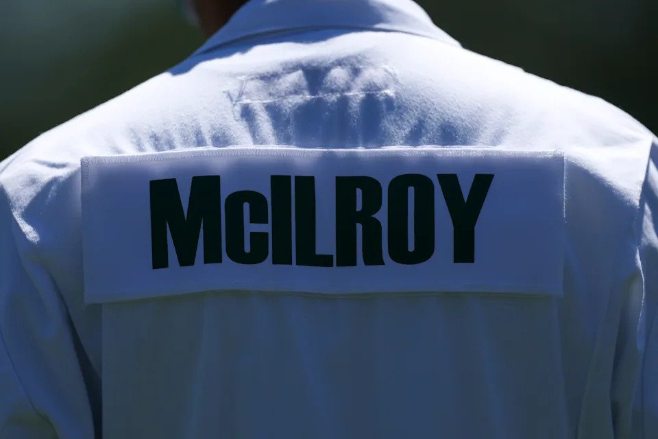 A detailed view of the name of Rory McIlroy of Northern Ireland on the back of his caddie Harry Diamond on the eighth green during the first round of the 2026 Masters Tournament at Augusta National Golf Club on April 9, 2026, in Augusta, Georgia.
