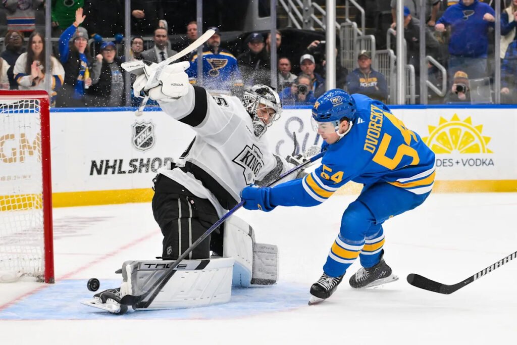 Dalibor Dvorsky also scored for the second straight game and had a beautiful shootout goal in the third round to extend the shootout, Brayden Schenn scored and Joel Hofer made 24 saves for the Blues, who saw their four-game home winning streak end.