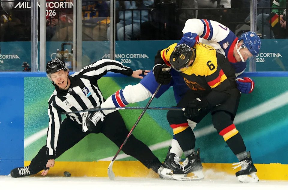 Brady Tkachuk of United States in action with Kai Wissmann of Germany as linesperson Nick Briganti looks on in men’s ice hockey group A play during the Milano Cortina 2026 Olympic Winter Games at Milano Santagiulia Ice Hockey Arena.