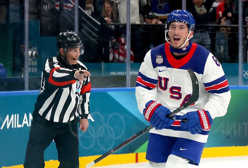 Jack Eichel #9 of Team United States celebrates a goal scored by Brock Faber #14 (not pictured) in the second period during the Men’s Preliminary Group C match between the United States and Germany on day nine of the Milano Cortina 2026 Winter Olympic games at Milano Santagiulia Ice Hockey Arena on Feb. 15, 2026 in Milan, Italy.
