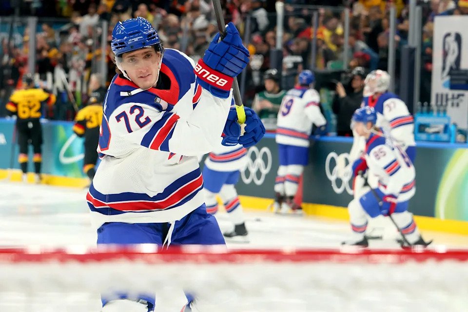 Tage Thompson #72 of Team United States warms up before the Men’s Preliminary Group C match between the United States and Germany on day nine of the Milano Cortina 2026 Winter Olympic games at Milano Santagiulia Ice Hockey Arena on Feb. 15, 2026 in Milan, Italy.
