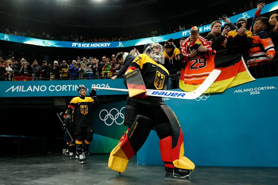 Germany players arrive during the warm up before the match against the United States in men’s ice hockey group C play during the Milano Cortina 2026 Olympic Winter Games at Milano Santagiulia Ice Hockey Arena.