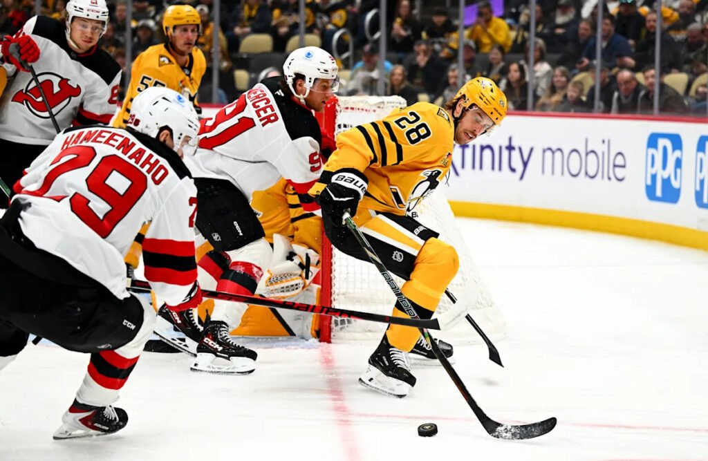The Devils adjust and respond in the second with a better effort and more control of the puck. They get their first power play when Malkin high sticks a guy.