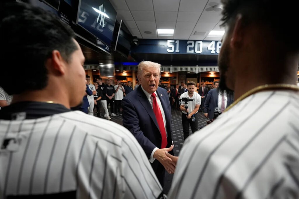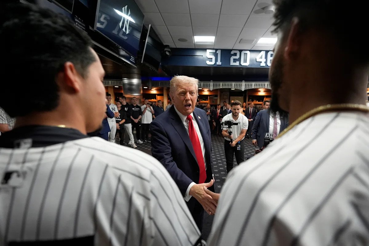 Trump addressed the Yankees’ players in the clubhouse before the game, reminiscing about late owner George Steinbrenner, predicting a World Series run for the team and taking credit for a 10-game win streak for the Boston Red Sox after some of their players visited him at the White House in July.