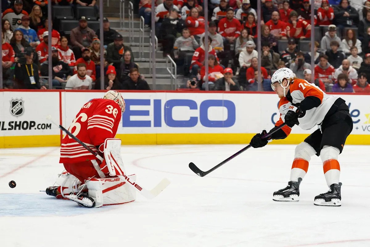 The Flyers not only scored on their first shot of the game, but built a 4–0 lead by the early third period, then held off a furious late push from the Red Wings to secure a 5–3 win and hand Detroit another damaging setback.