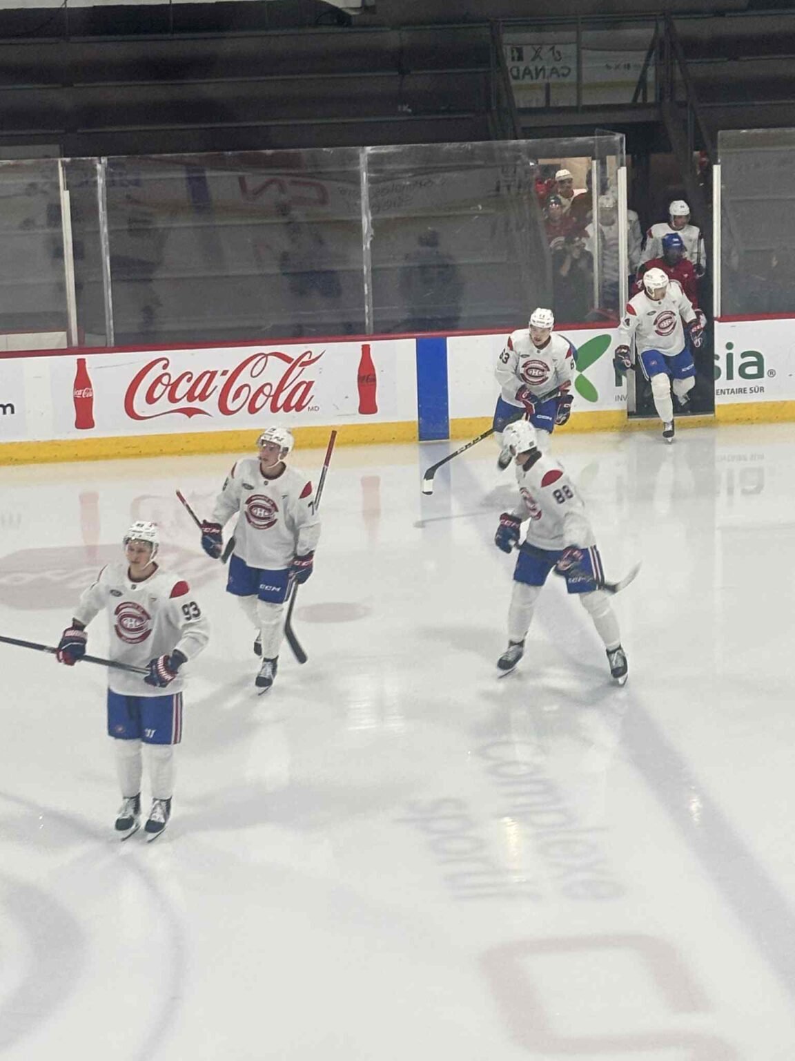 Unlike last season, the rookies were forced to take a break midway through the practice to allow the Zamboni to do its job. Last year, the players went to the other rink, but that wasn’t possible this time around; the other ice was hosting the Canadiens’ veterans, who were all hard at work.