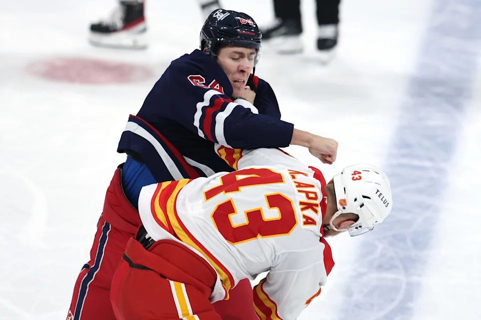 Oct. 24: Calgary Flames right wing Adam Klapka (43) and Winnipeg Jets defenseman Logan Stanley (64) fight in the first period at Canada Life Centre.