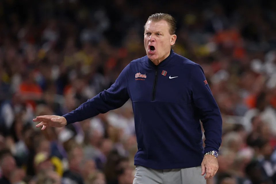 Head coach Brad Underwood of the Illinois Fighting Illini reacts against the UConn Huskies during the first half in the Final Four of the 2026 NCAA Men’s Basketball Tournament at Lucas Oil Stadium on April 04, 2026 in Indianapolis, Indiana.