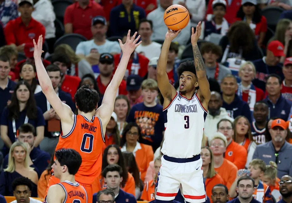 UConn Huskies forward Jaylin Stewart (3) shoots the ball over Illinois Fighting Illini forward David Mirkovic (0) in the first half during a semifinal of the Final Four of the men’s 2026 NCAA Tournament at Lucas Oil Stadium.